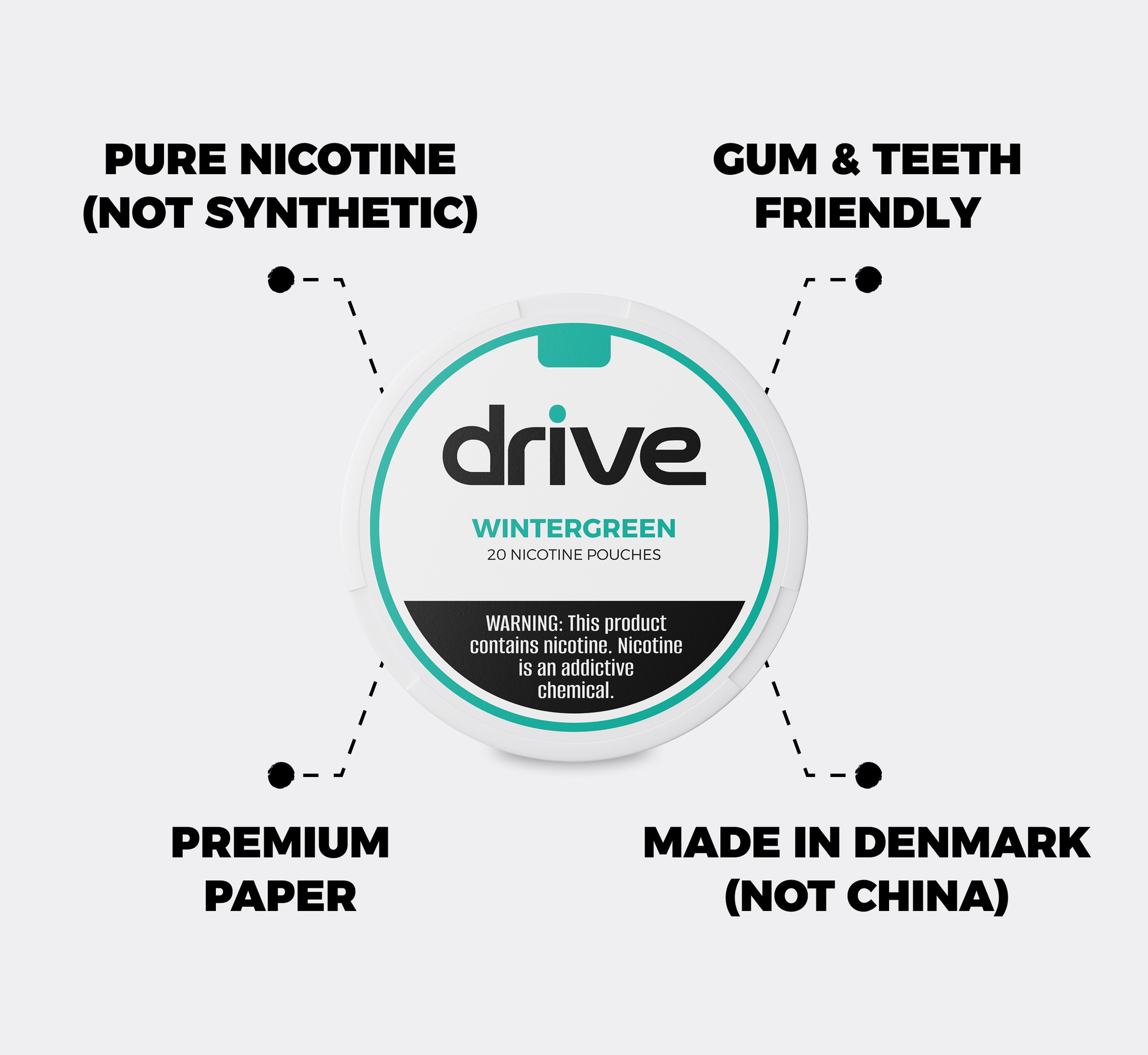 Experience icy freshness on the go. Drive Wintergreen Nicotine Pouches deliver a crisp, minty kick – 100% tobacco-free, discreet, and smoke-free.
